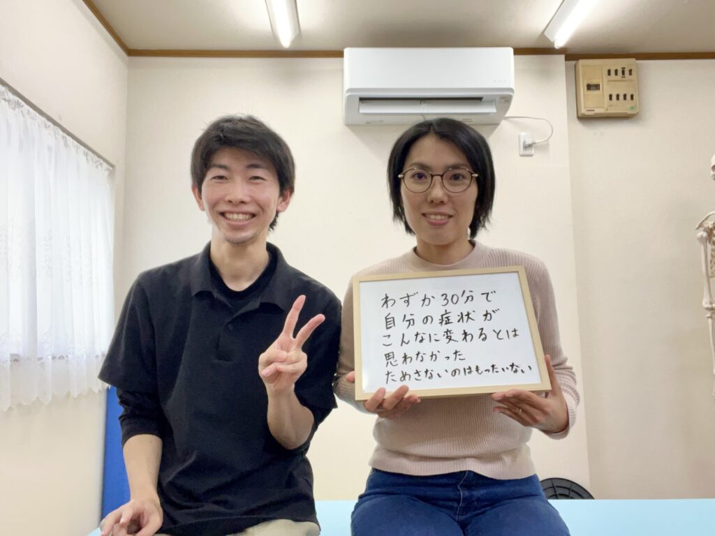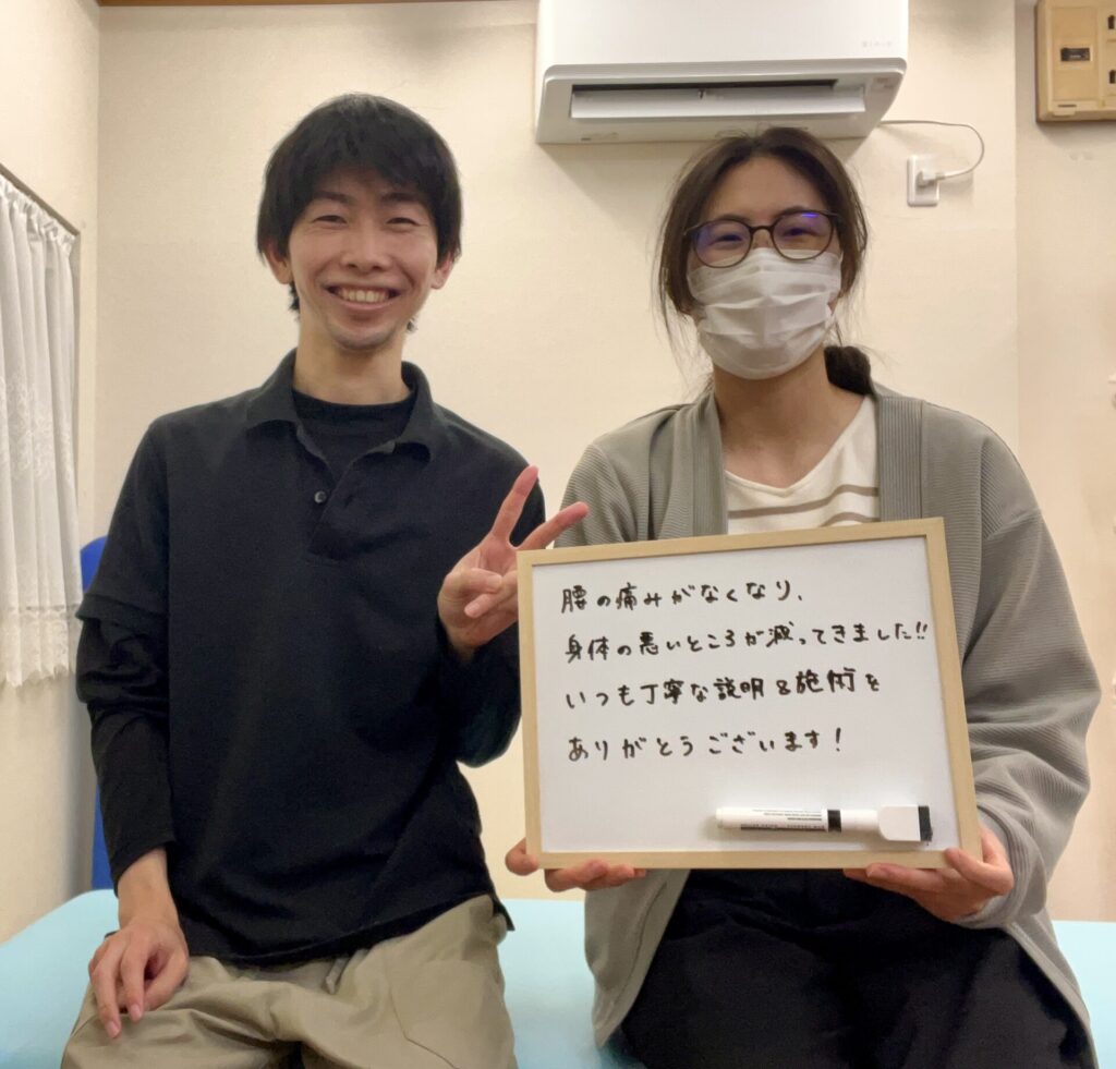 通っているうちに、腰の痛みがなくなり、体の悪いところが減ってきました!!いつも丁寧な説明&施術をありがとうございます!